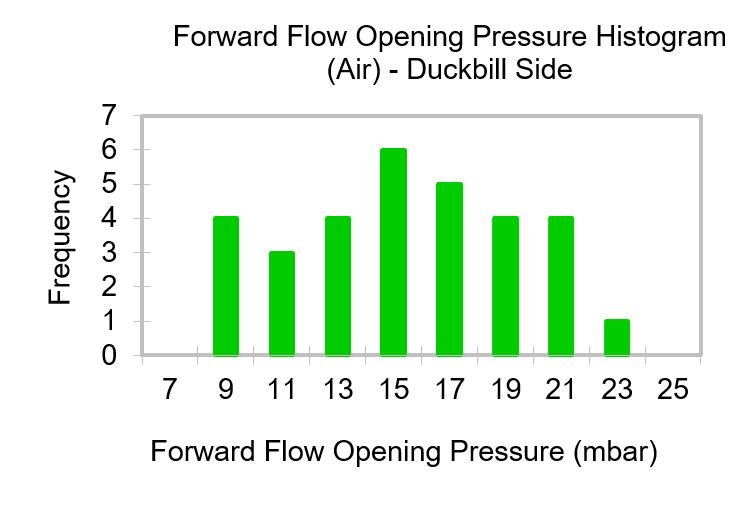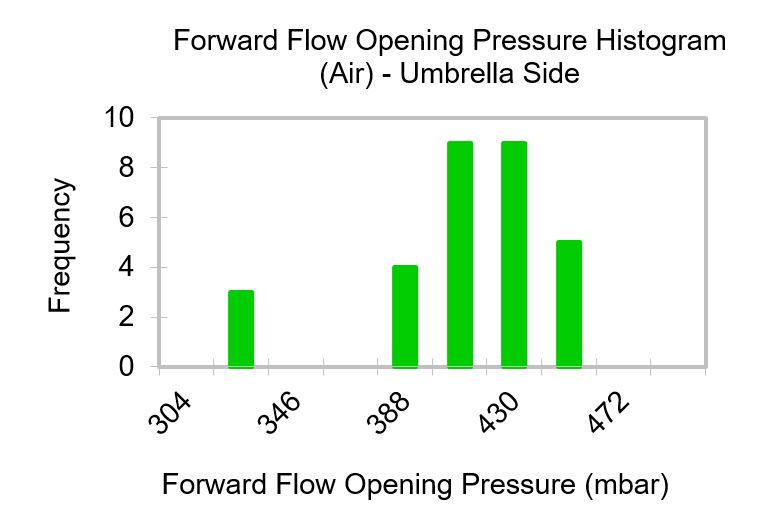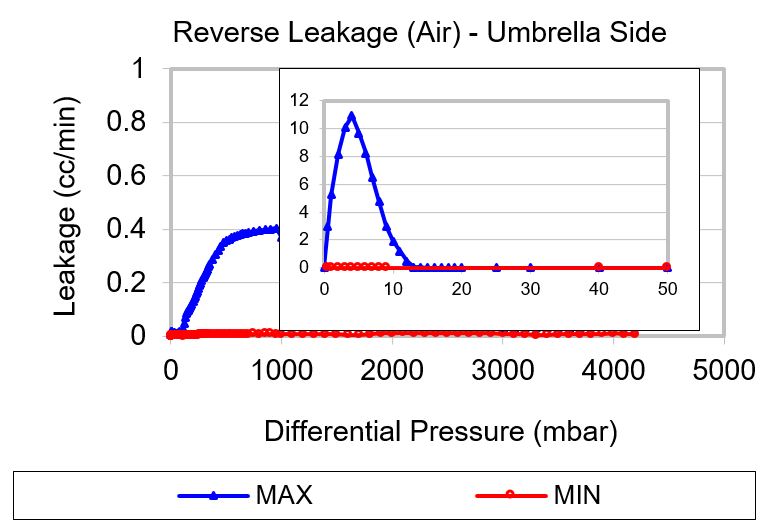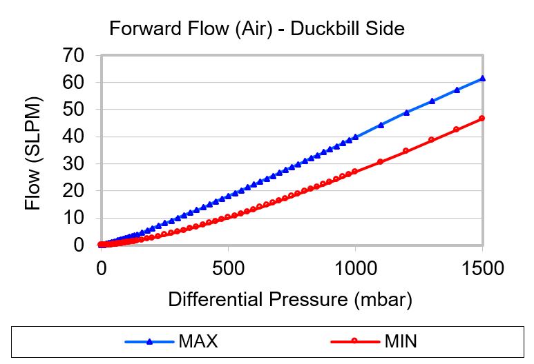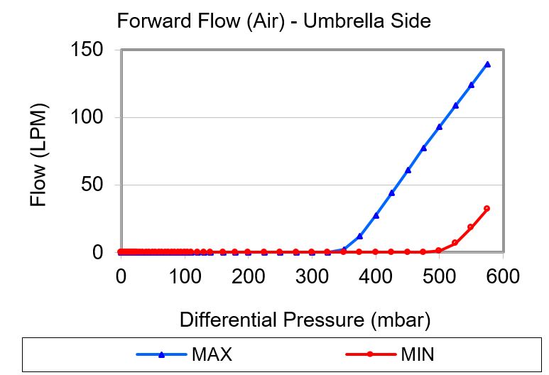 Flow and differential pressure are measured simultaneously while increasing the inlet pressure, starting from zero. After reaching a maximum flow, the pressure is reduced to zero while measuring flow and differential pressure. The chart shows the minimum and maximum flows measured during the tests of multiple samples at each pressure.