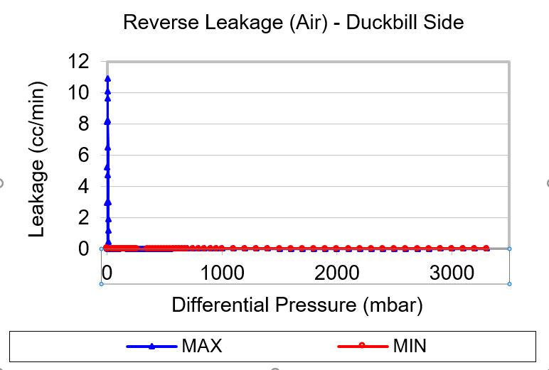 Leakage, or flow in the reverse direction, is measured while increasing the backpressure across the valve, starting from zero. Please note that leakage graph is on a different scale from those of flow.