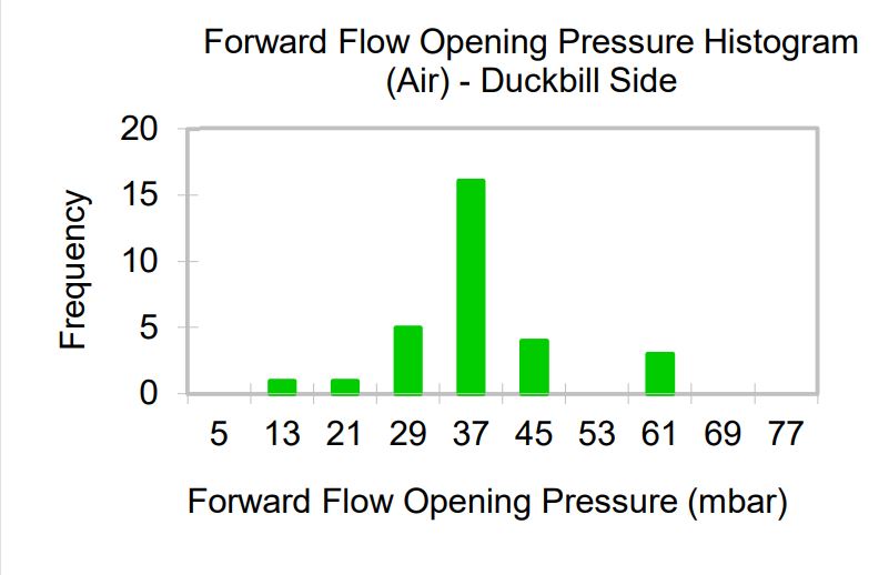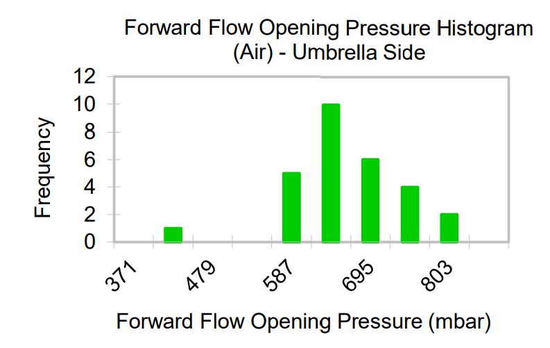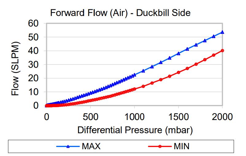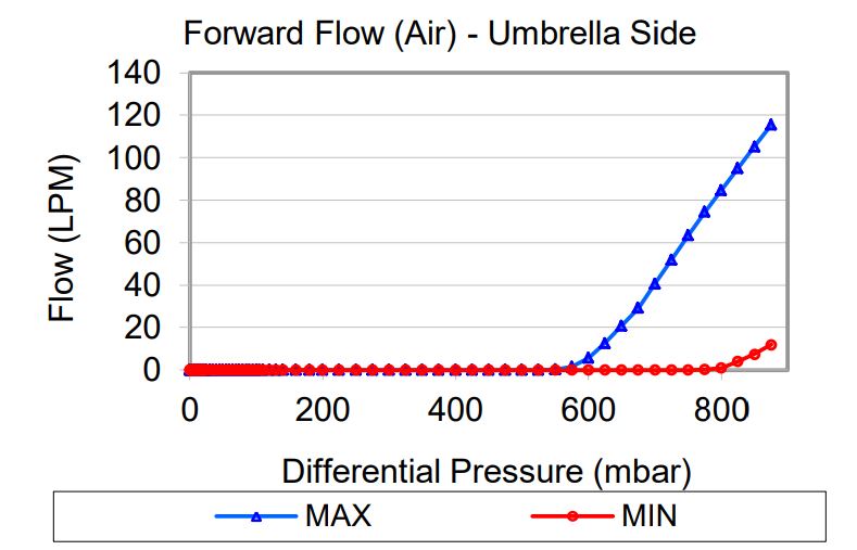 Flow and differential pressure are measured simultaneously while increasing the inlet pressure, starting from zero. After reaching a maximum flow, the pressure is reduced to zero while measuring flow and differential pressure. The chart shows the minimum and maximum flows measured during the tests of multiple samples at each pressure.
