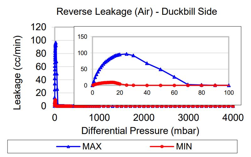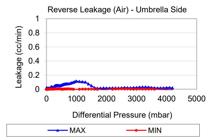 Leakage, or flow in the reverse direction, is measured while increasing the backpressure across the valve, starting from zero. Please note that leakage graph is on a different scale from those of flow.