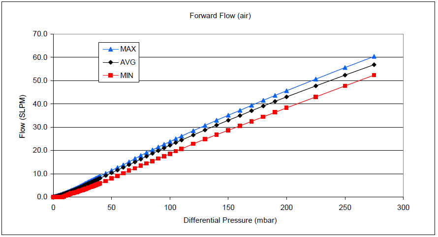 Flow and differential pressure are measured simultaneously as the inlet pressure increases from zero. Once the maximum flow is reached, the pressure is gradually reduced back to zero, with flow and differential pressure measured throughout the process. The chart displays the minimum and maximum flow values recorded during tests of multiple samples at each pressure level. Water test data is available upon request.