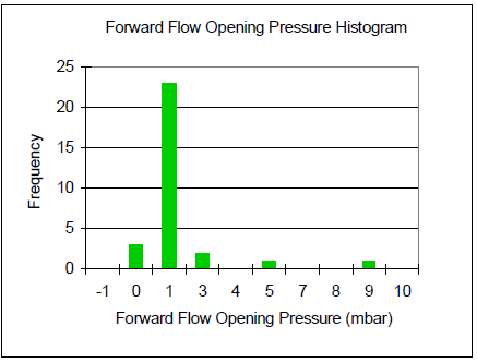 Duckbill valves achieve backflow sealing through pressure-induced contact forces along the two side planes. To create an effective seal, some reverse pressure must be applied. In the forward flow direction, there is no distinct opening pressure; however, our laboratory uses a standard threshold of 1 cc/min for measurement purposes. Forward flow depends on the pressure differential across the valve's flow path and the degree of opening in the lip zone.