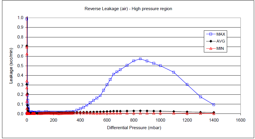 Leakage, or reverse flow, is measured by gradually increasing the backpressure across the valve, starting from zero. Please note that the leakage graph uses a different scale compared to the flow graphs. Water test data is available upon request.