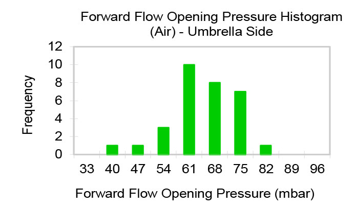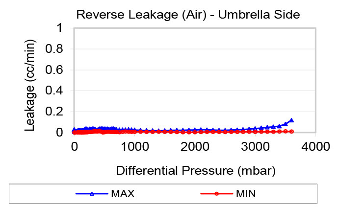 Flow and differential pressure are measured simultaneously as the inlet pressure increases from zero. Once the maximum flow is reached, the pressure is gradually reduced back to zero, with flow and differential pressure measured throughout the process. The chart displays the minimum and maximum flow values recorded during tests of multiple samples at each pressure level. Water test data is available upon request.