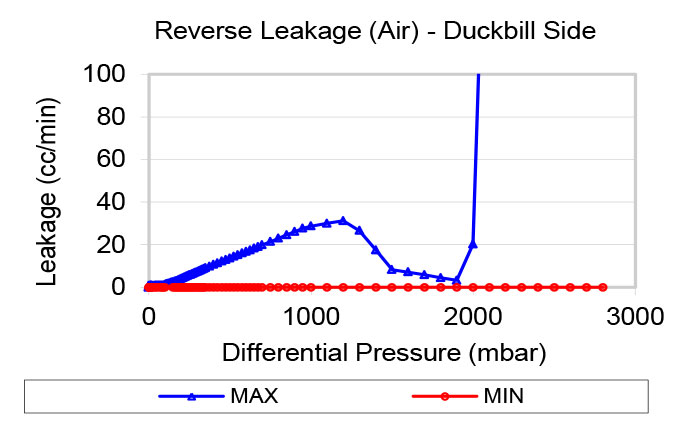 Leakage, or reverse flow, is measured by gradually increasing the backpressure across the valve, starting from zero. Please note that the leakage graph uses a different scale compared to the flow graphs. Water test data is available upon request.