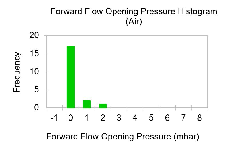 Duckbill valves achieve backflow sealing through pressure-induced contact forces along the two side planes. To create an effective seal, some reverse pressure must be applied. In the forward flow direction, there is no distinct opening pressure; however, our laboratory uses a standard threshold of 1 cc/min for measurement purposes. Forward flow depends on the pressure differential across the valve's flow path and the degree of opening in the lip zone.
