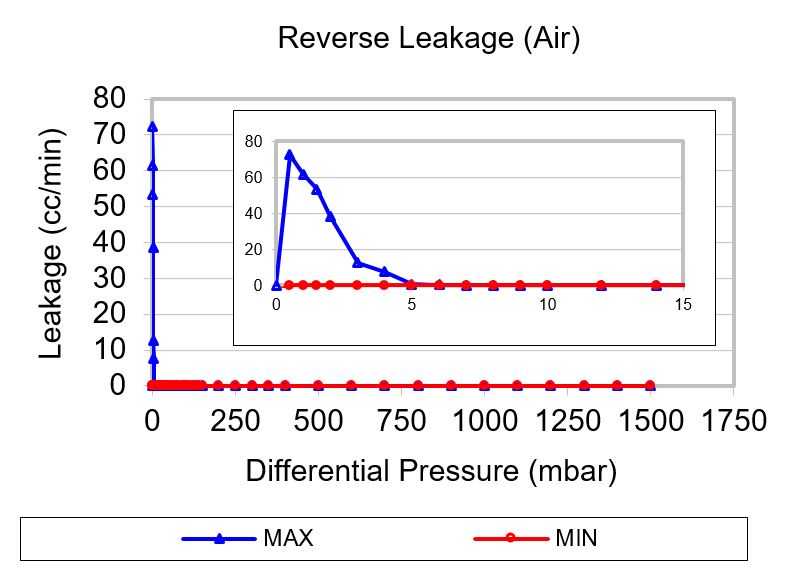 Leakage, or reverse flow, is measured by gradually increasing the backpressure across the valve, starting from zero. Please note that the leakage graph uses a different scale compared to the flow graphs. Water test data is available upon request.