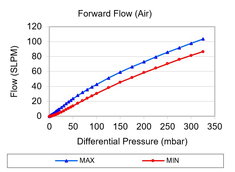 Flow and differential pressure are measured simultaneously as the inlet pressure increases from zero. Once the maximum flow is reached, the pressure is gradually reduced back to zero, with flow and differential pressure measured throughout the process. The chart displays the minimum and maximum flow values recorded during tests of multiple samples at each pressure level. Water test data is available upon request.