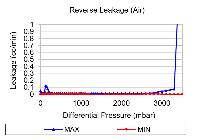 Leakage, or reverse flow, is measured by gradually increasing the backpressure across the valve, starting from zero. Please note that the leakage graph uses a different scale compared to the flow graphs. Water test data is available upon request.