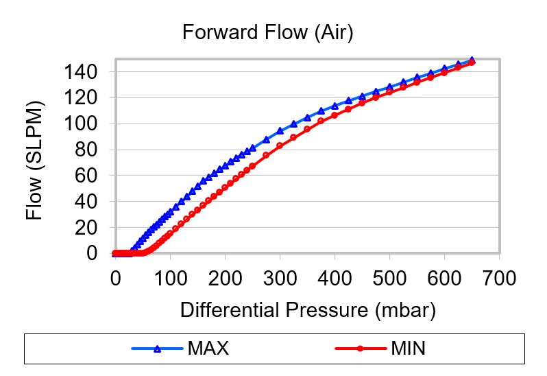 Flow and differential pressure are measured simultaneously as the inlet pressure increases from zero. Once the maximum flow is reached, the pressure is gradually reduced back to zero, with flow and differential pressure measured throughout the process. The chart displays the minimum and maximum flow values recorded during tests of multiple samples at each pressure level. Water test data is available upon request.