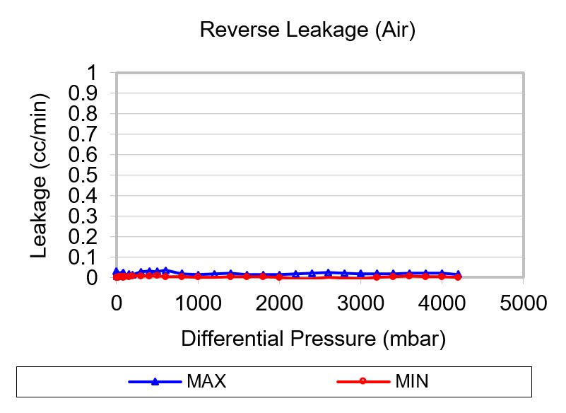 Leakage, or reverse flow, is measured by gradually increasing the backpressure across the valve, starting from zero. Please note that the leakage graph uses a different scale compared to the flow graphs. Water test data is available upon request.