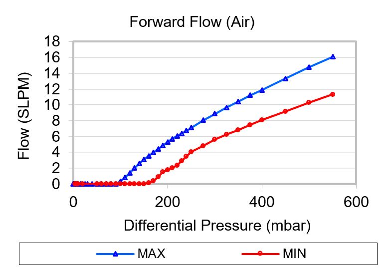 Flow and differential pressure are measured simultaneously as the inlet pressure increases from zero. Once the maximum flow is reached, the pressure is gradually reduced back to zero, with flow and differential pressure measured throughout the process. The chart displays the minimum and maximum flow values recorded during tests of multiple samples at each pressure level. Water test data is available upon request.