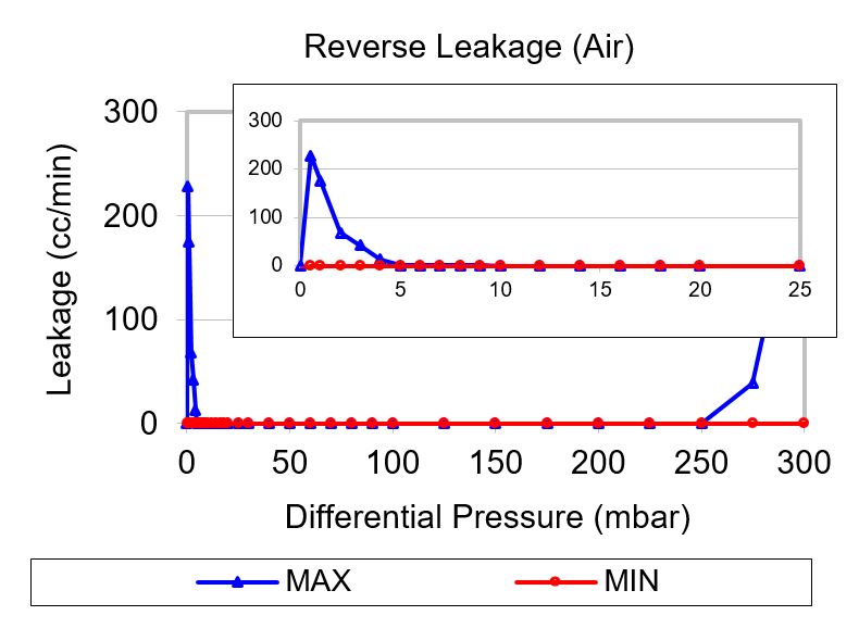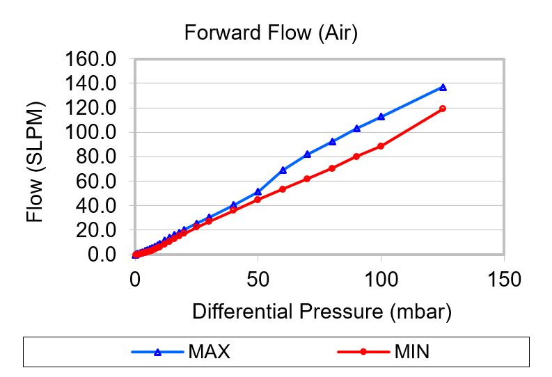 Flow and differential pressure are measured simultaneously as the inlet pressure increases from zero. Once the maximum flow is reached, the pressure is gradually reduced back to zero, with flow and differential pressure measured throughout the process. The chart displays the minimum and maximum flow values recorded during tests of multiple samples at each pressure level. Water test data is available upon request.