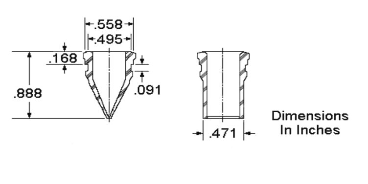 The valve is designed to snap into a 2.03 mm or less thick plate with a Ø 12.06 mm hole. For proper function there must be a small clearance around the barrel (cylindrical portion) of the valve.
