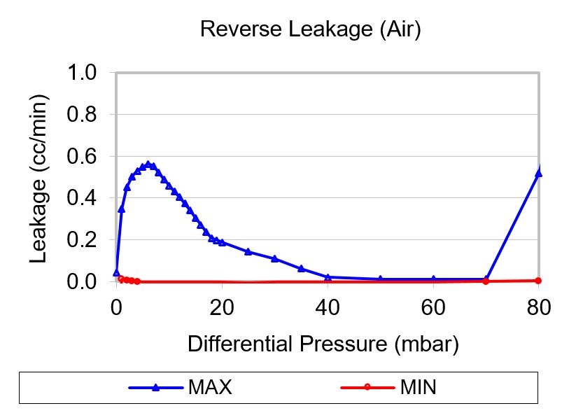 Leakage, or reverse flow, is measured by gradually increasing the backpressure across the valve, starting from zero. Please note that the leakage graph uses a different scale compared to the flow graphs. Water test data is available upon request.
