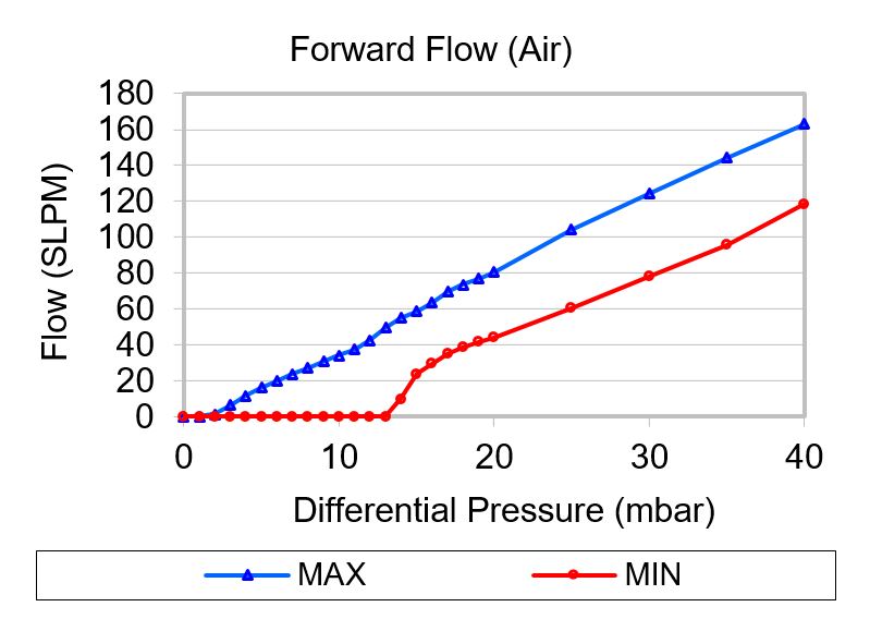 Flow and differential pressure are measured simultaneously as the inlet pressure increases from zero. Once the maximum flow is reached, the pressure is gradually reduced back to zero, with flow and differential pressure measured throughout the process. The chart displays the minimum and maximum flow values recorded during tests of multiple samples at each pressure level. Water test data is available upon request.