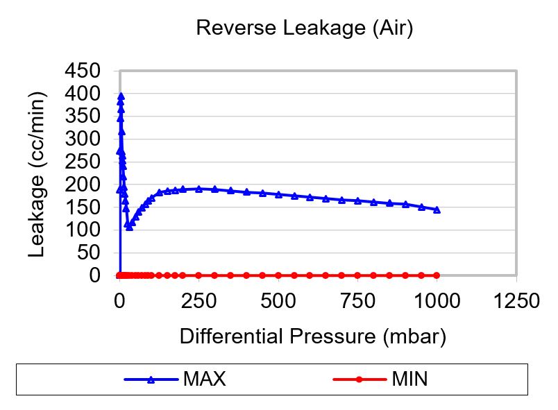 Leakage, or reverse flow, is measured by gradually increasing the backpressure across the valve, starting from zero. Please note that the leakage graph uses a different scale compared to the flow graphs. Water test data is available upon request.