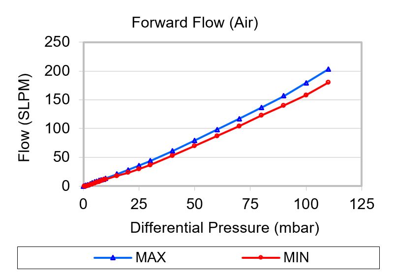 Flow and differential pressure are measured simultaneously as the inlet pressure increases from zero. Once the maximum flow is reached, the pressure is gradually reduced back to zero, with flow and differential pressure measured throughout the process. The chart displays the minimum and maximum flow values recorded during tests of multiple samples at each pressure level. Water test data is available upon request.